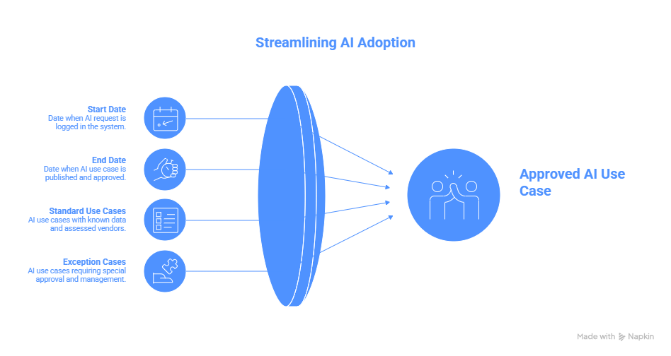 What it represents: the time from a business request (“We want this AI tool for X”) to an approved, governed use case that teams can adopt without guesswork.